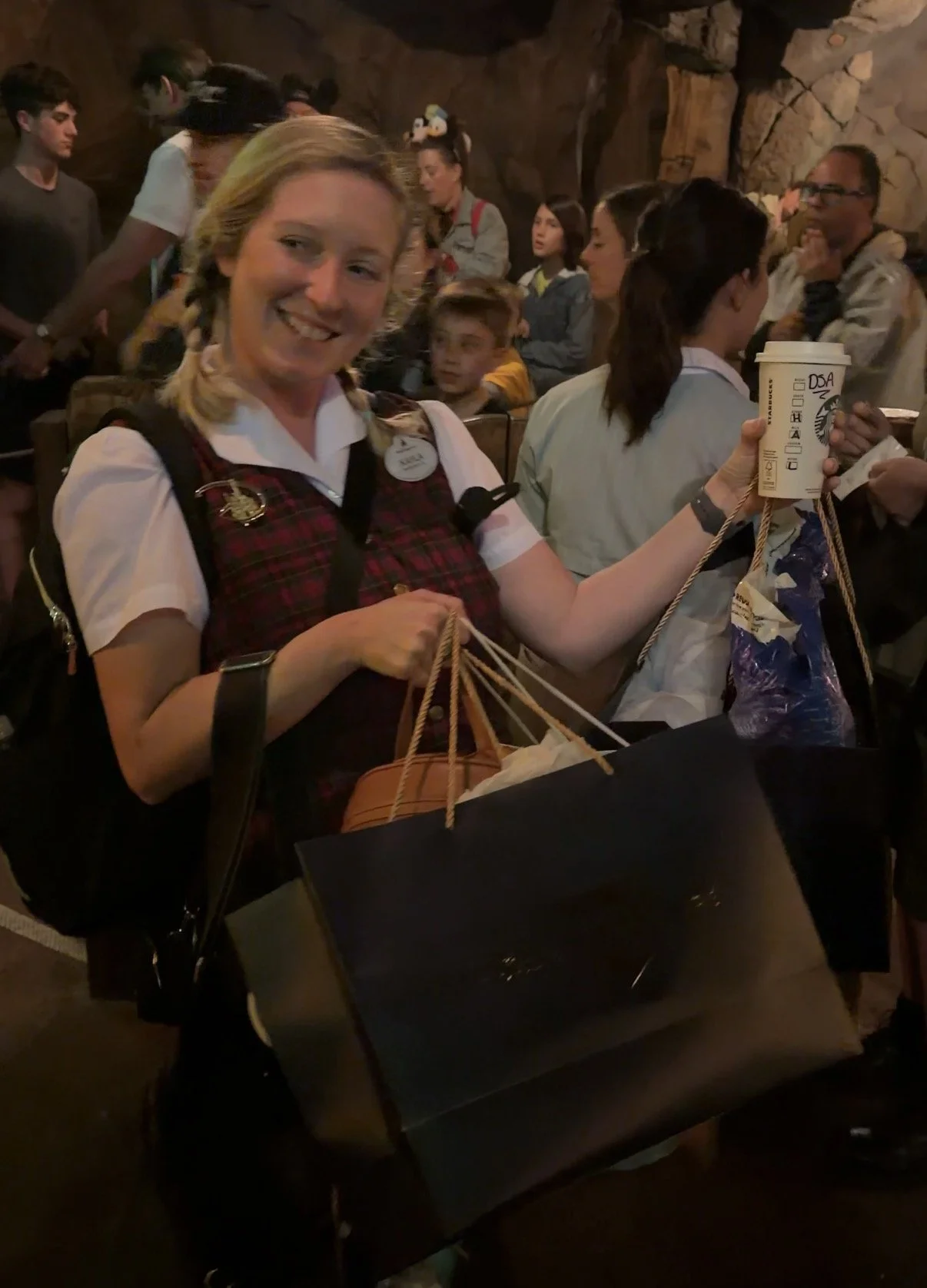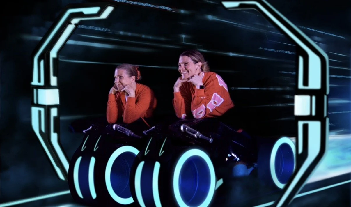 Holding our bags so we didn’t have to squish them by our feet on the rides or get a locker at Tron