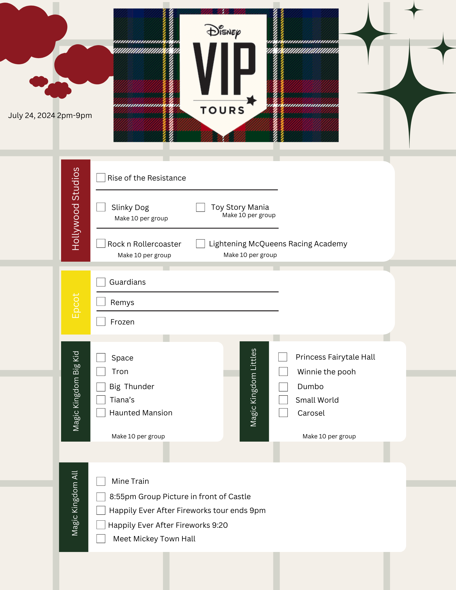 On a last note…one time we did a double tour so I made this multi-group schedule to help us all stay on track. But VIP tours can be as go go go or relaxing as you want to make them!